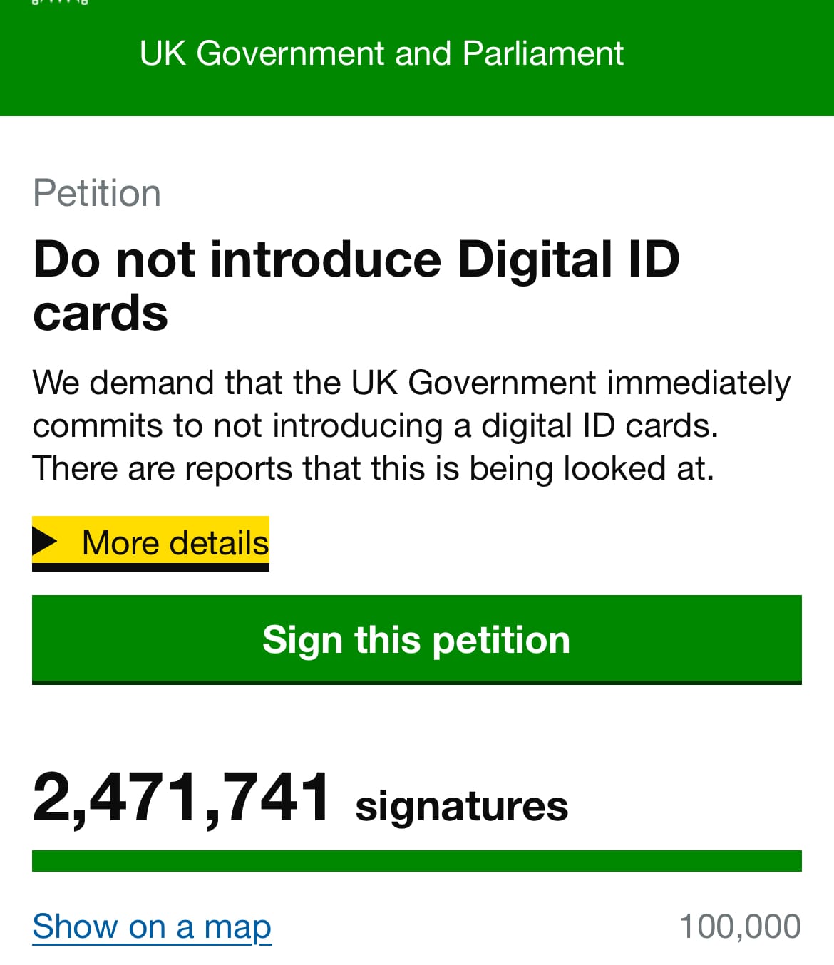 But the people’s response has been immediate and overwhelming. In just 72 hours, over 2.4 million UK residents—and the number keeps climbing—signed the petition “Do not introduce Digital ID cards” launched by Maxim Sutcliff, which rejects the idea of being forced into a system that strips away privacy and control.